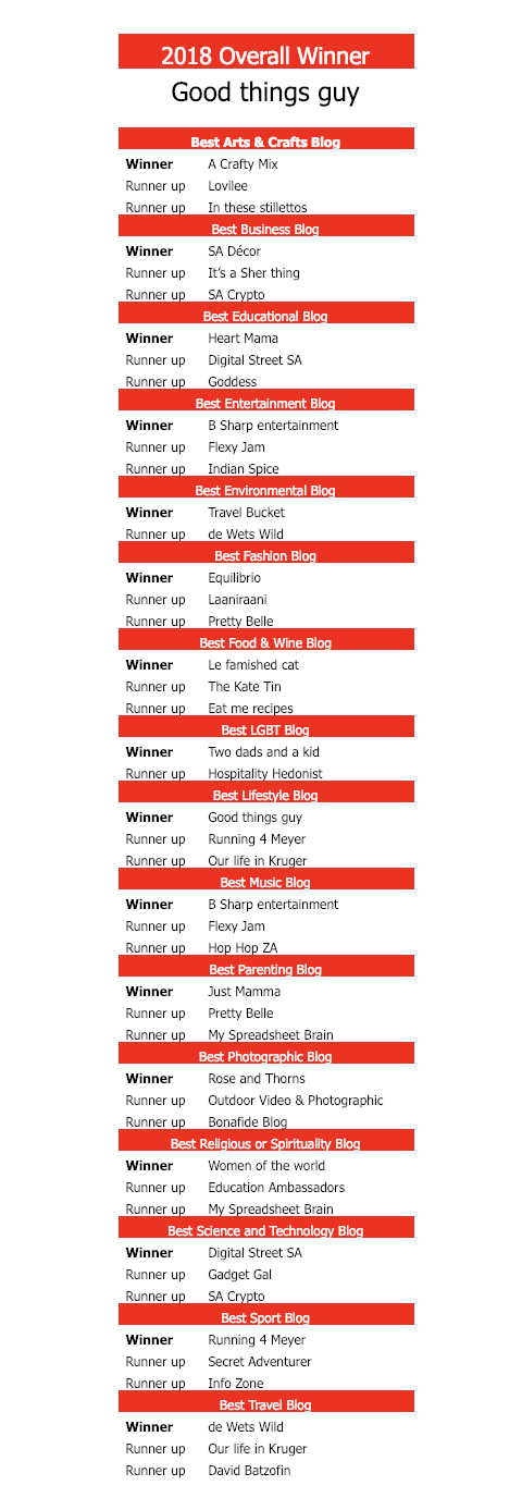 GoodThingsGuy won the award for the Best Lifestyle Blog and took the top spot as South Africa’s Blog of the Year for a second year in a row!