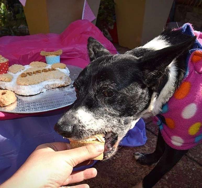 Stitch was born in a dog shelter and has never had an owner of her own; she is being fostered now in her late years, and the community have thrown her a party.