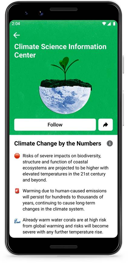 Modelled on the Facebook COVID-19 Information Centre—which has, so far, directed more than 2 billion people to information from health authorities—the Climate Science Information Centre offers facts about climate change and actionable steps people can take in their everyday lives to combat climate change.