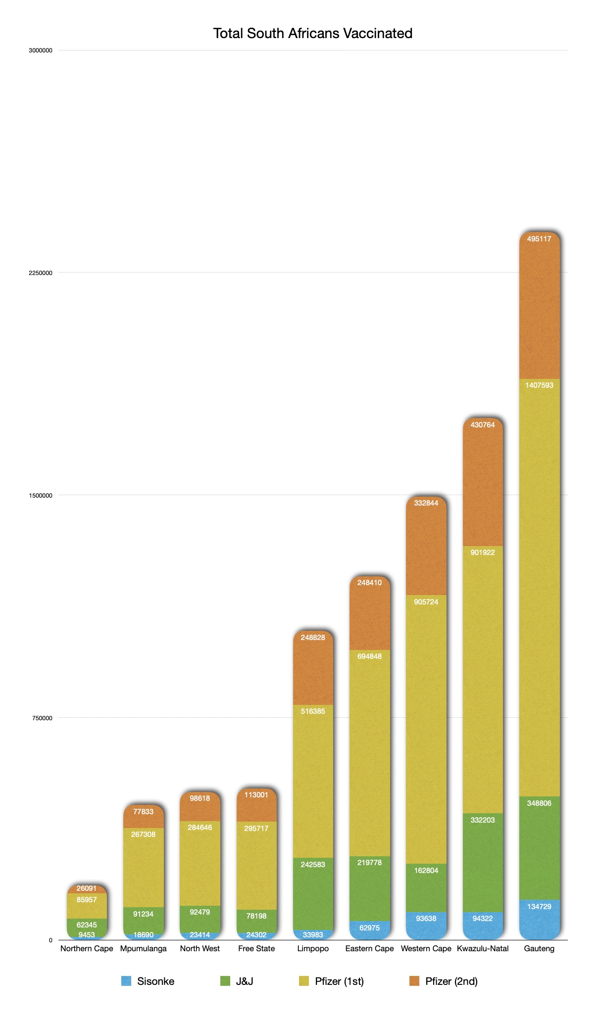 The country started the vaccination roll-out on the 18th of February 2021 and to date, 9,557,542 vaccines have been administered, with 4,197,442 South Africans now completely vaccinated.