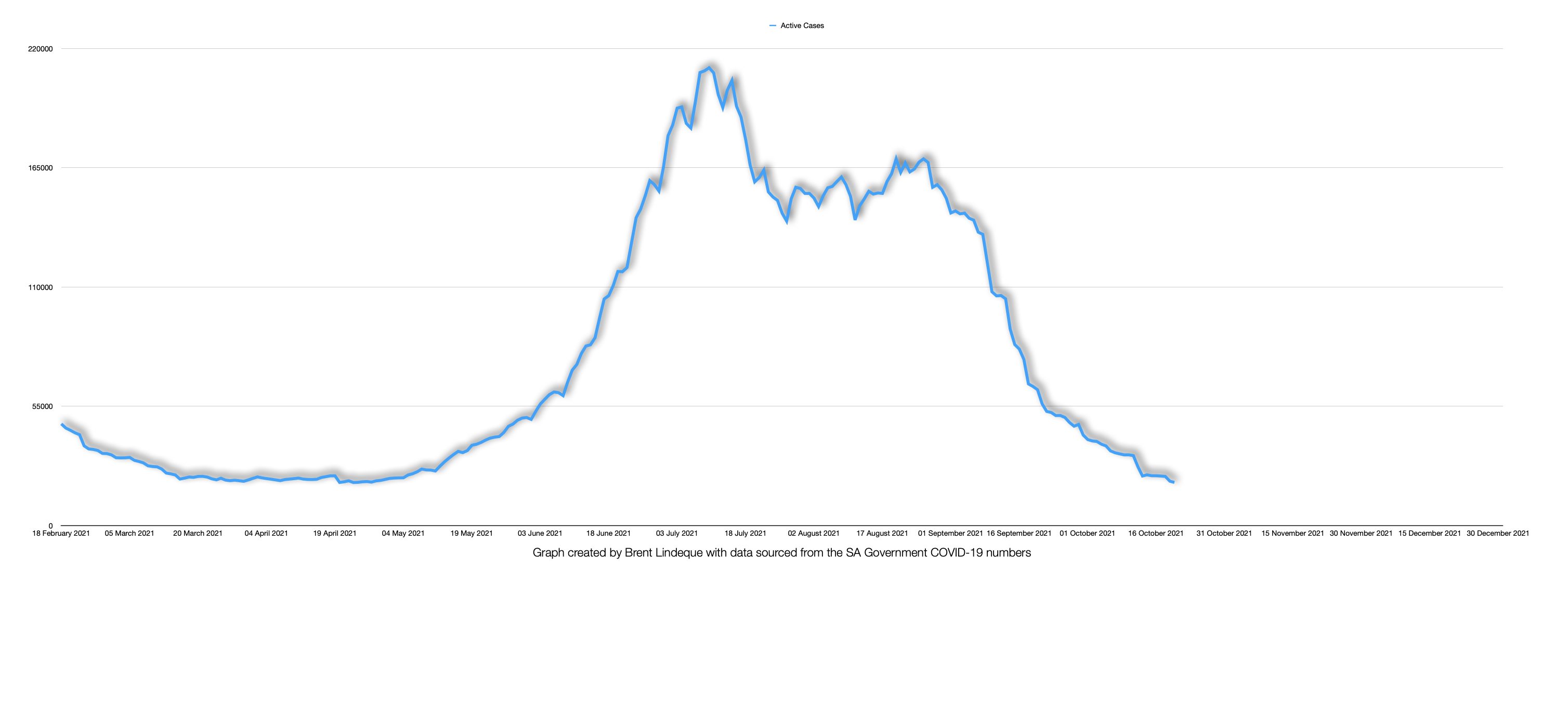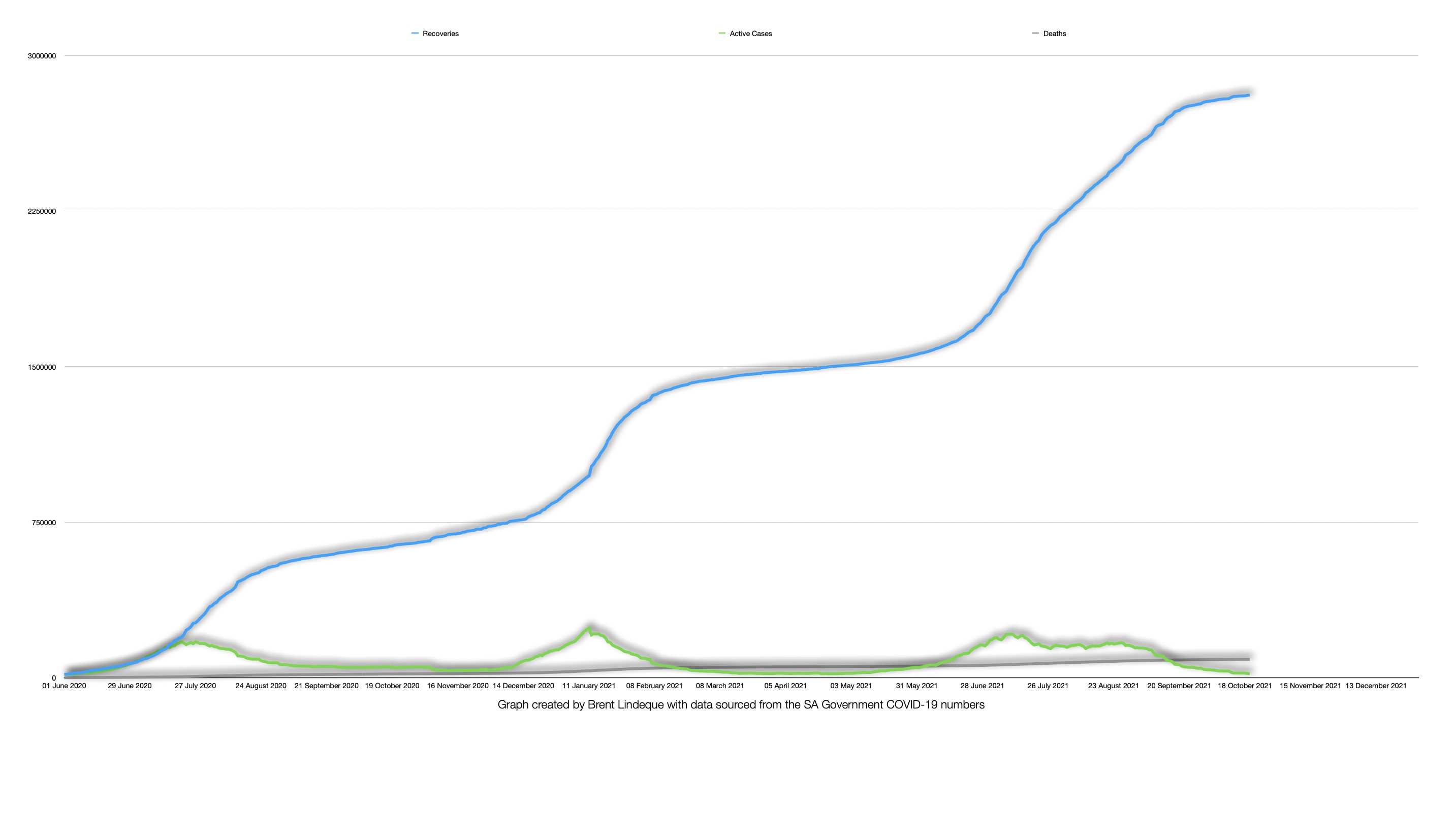 South Africa (20 October 2021) – In the last 24 hours, South Africa has seen an increase of 591 new COVID-19 infections, which brings our active cases to 19,854 and our recoveries to 2,809,238. We currently have a 96,5% recovery rate in closed cases and are making our way to even more recoveries every day.