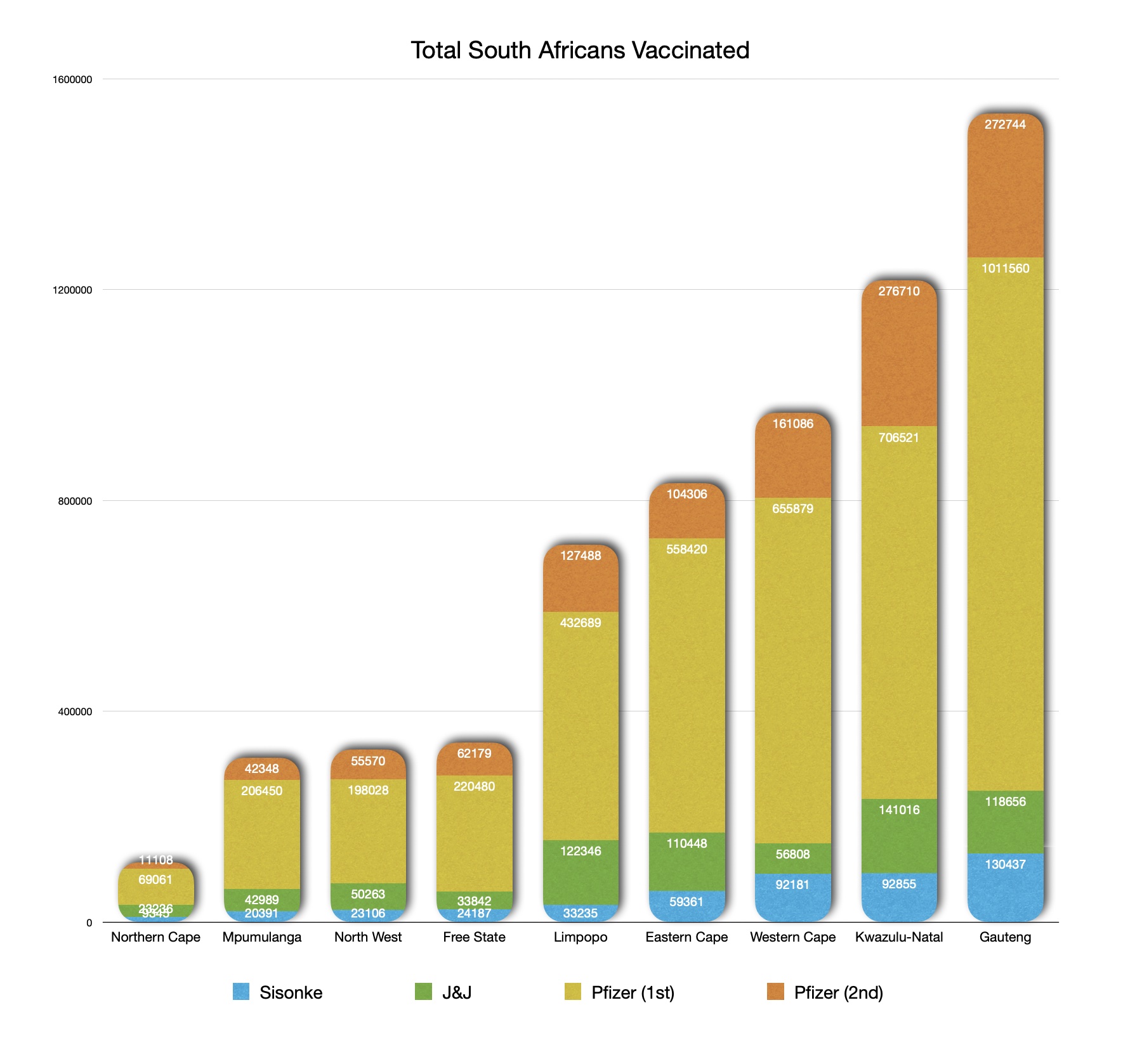 The country started the vaccination roll-out on the 18th of February 2021 and to date, 6,357,329 vaccines have been administered, with 2,298,241 South Africans now completely vaccinated.