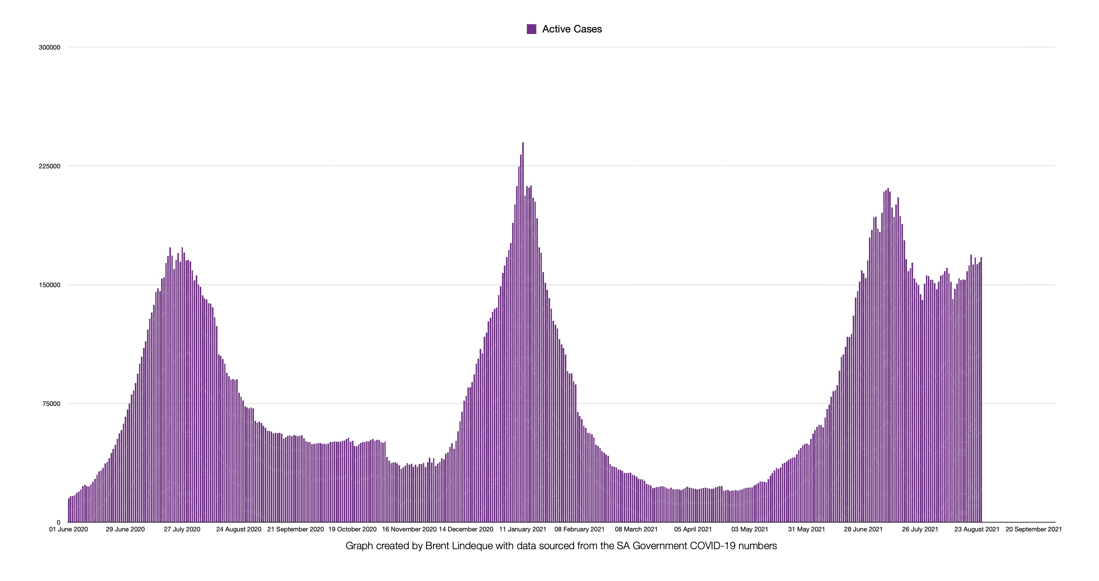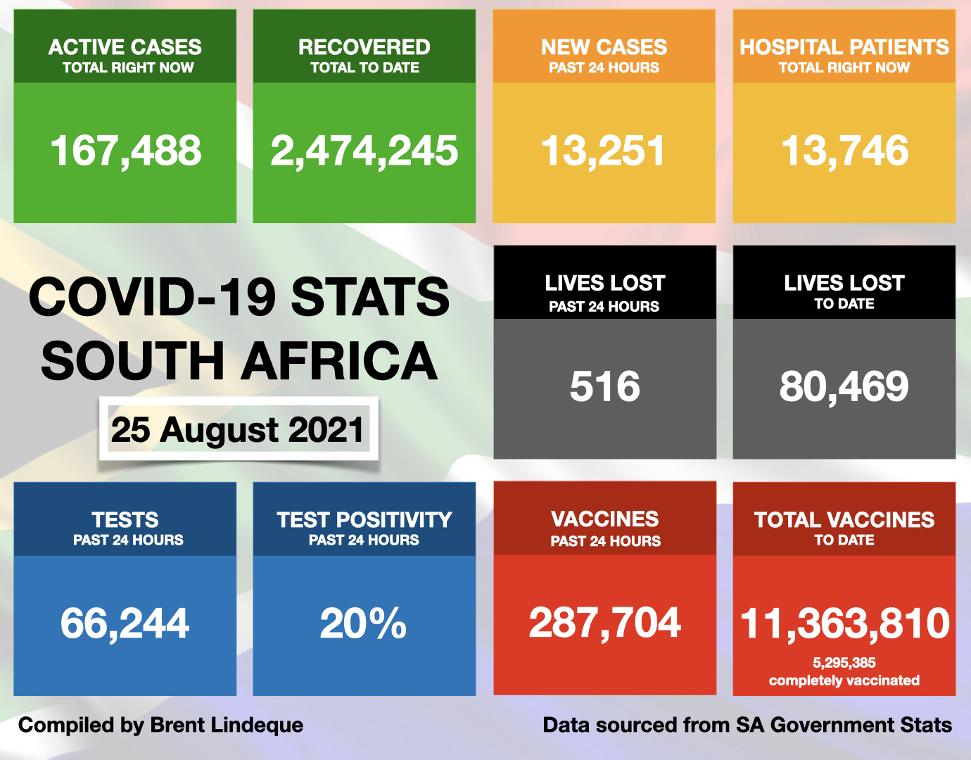 South Africa (25 August 2021) – In the last 24 hours, South Africa has seen an increase of 13,251 new COVID-19 infections, which brings our active cases to 167,488 and our recoveries to 2,474,245. We currently have a 96,5% recovery rate in closed cases and are making our way to even more recoveries every day.