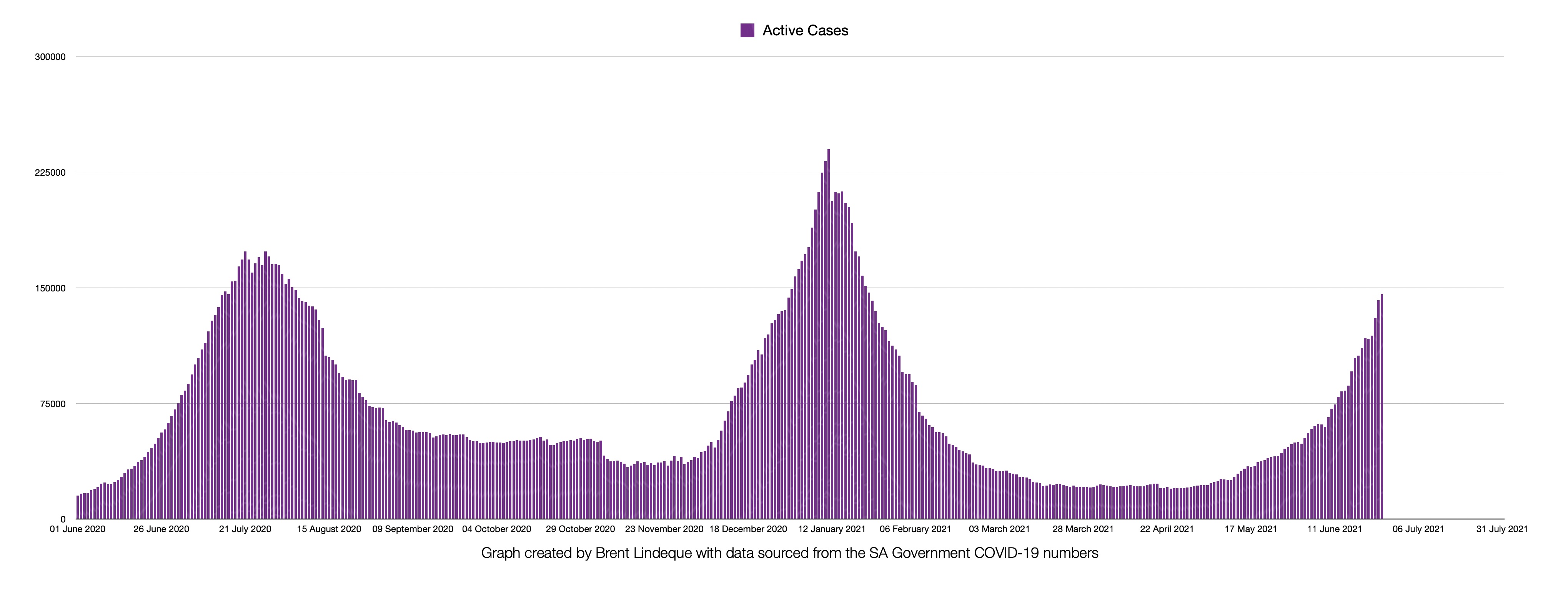 As of today, the cumulative number of COVID-19 active cases identified in South Africa is 145,904, with 18,762 new cases reported over the past 24 hours.