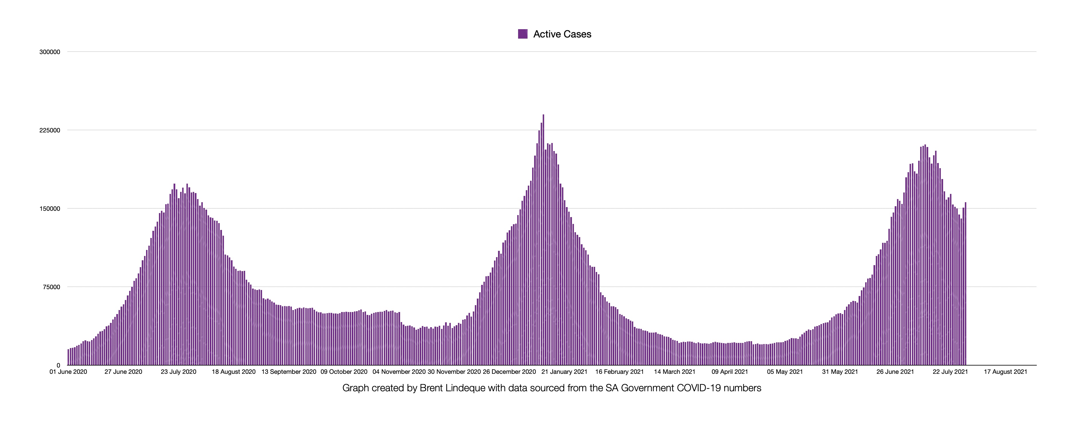 As of today, the cumulative number of COVID-19 active cases identified in South Africa is 155,958 with 13,751 new cases reported over the past 24 hours.