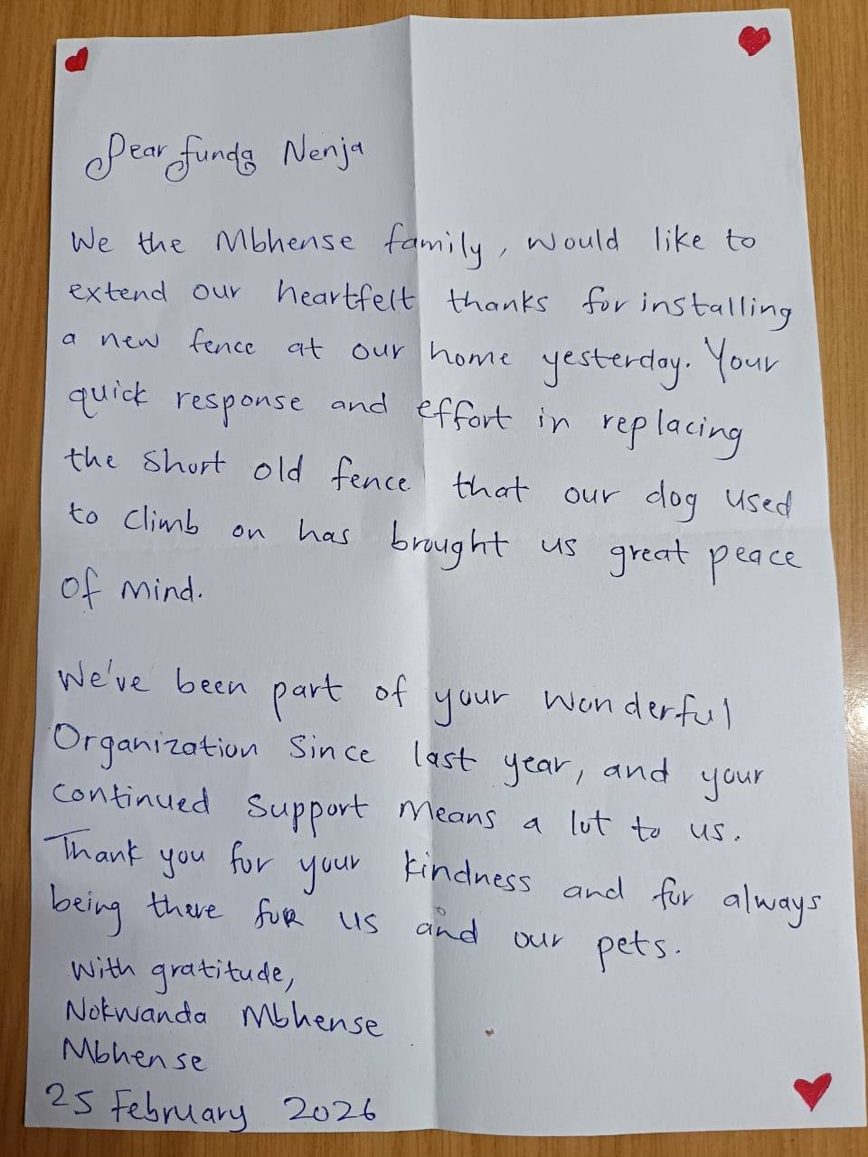 “We, the Mbhense family, would like to extend our heartfelt thanks for installing a new fence at our home. Your quick response and effort in replacing the short old fence that our dog used to climb on have brought us great peace of mind. We’ve been part of your wonderful organisation since last year, and your continued support means a lot to us. Thank you for your kindness and for always being there for us and our pets.”