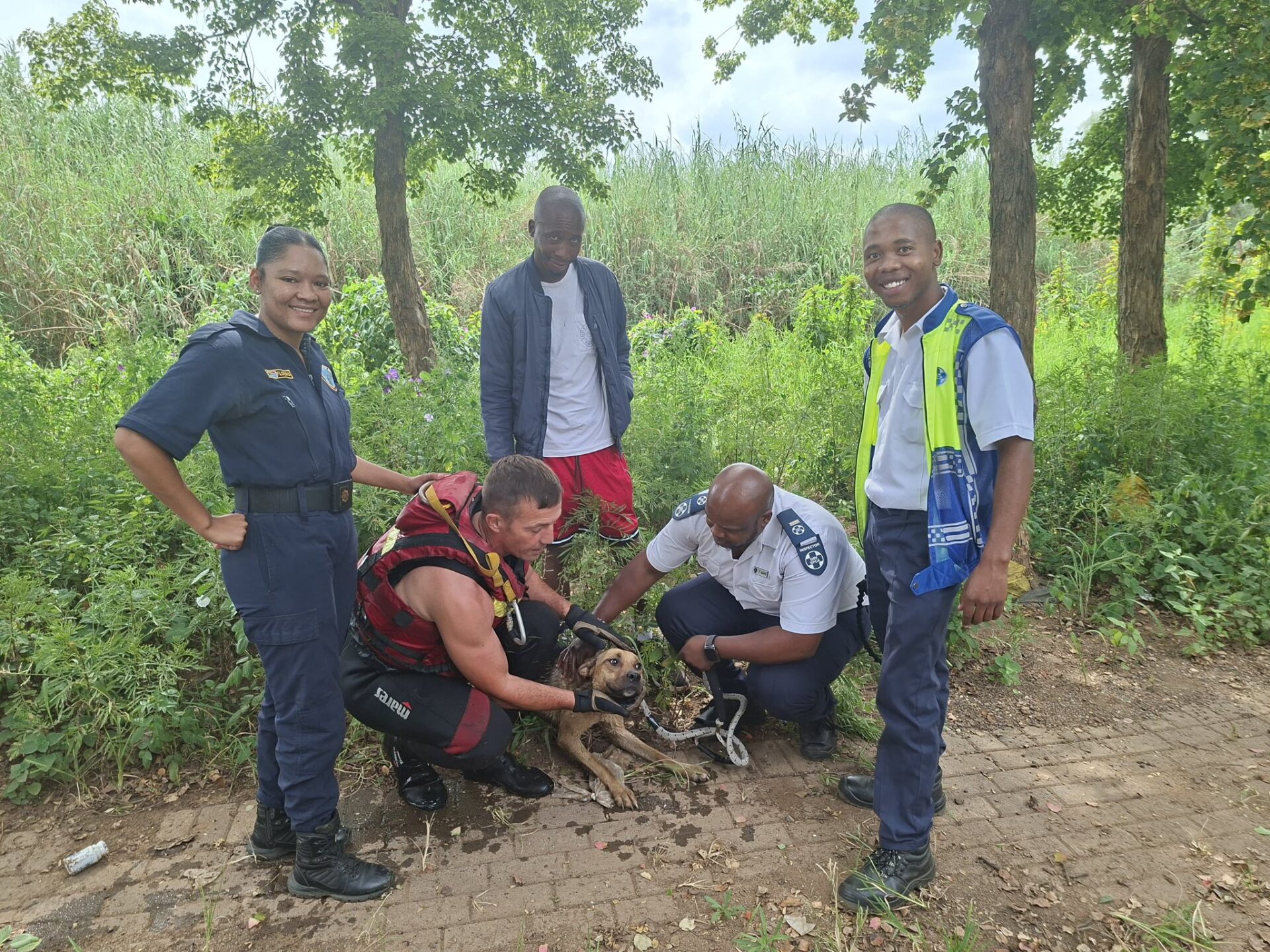 They reached out to the South African Police Service Tshwane Diving Unit, whose expertise and teamwork were instrumental in safely retrieving the frightened dog from the island.