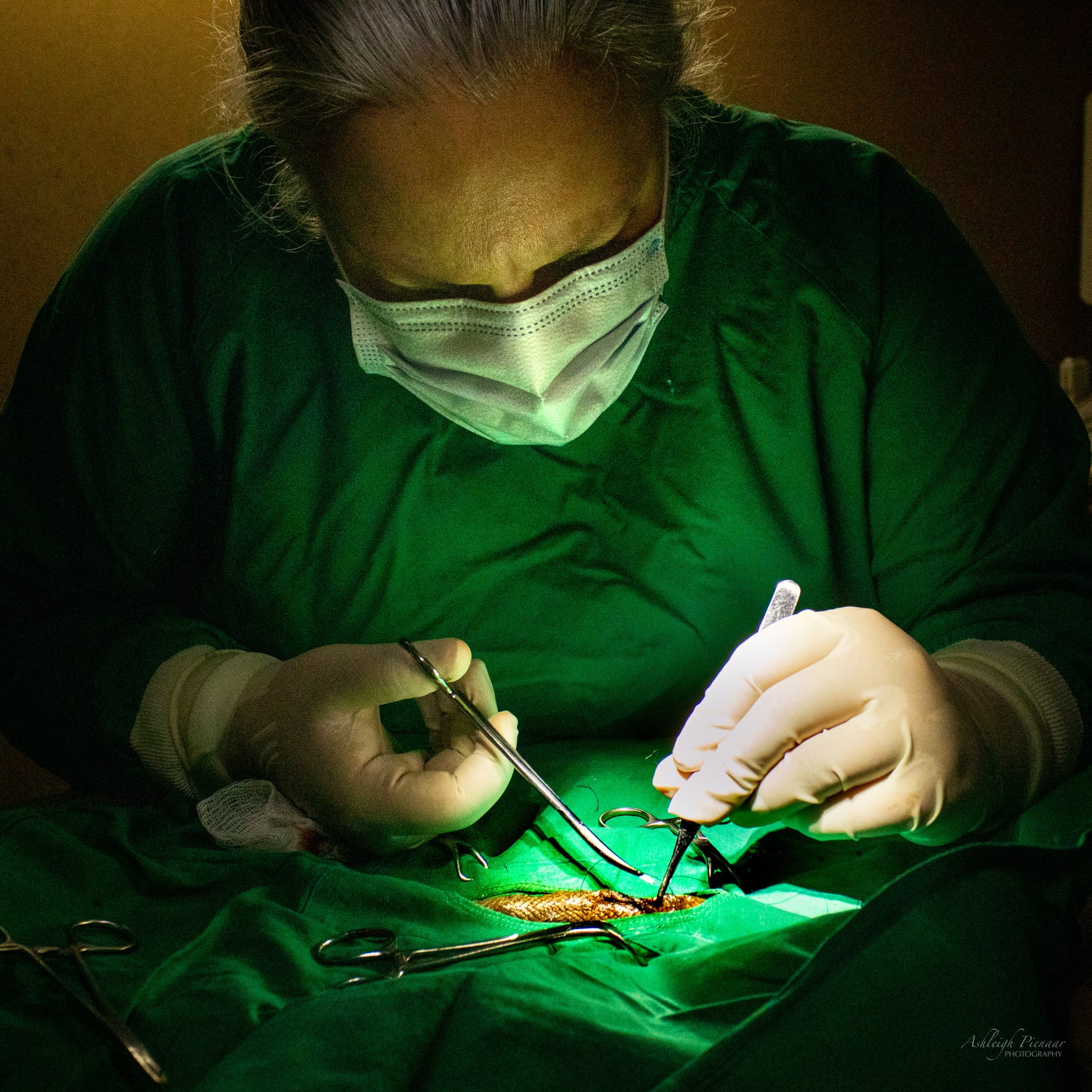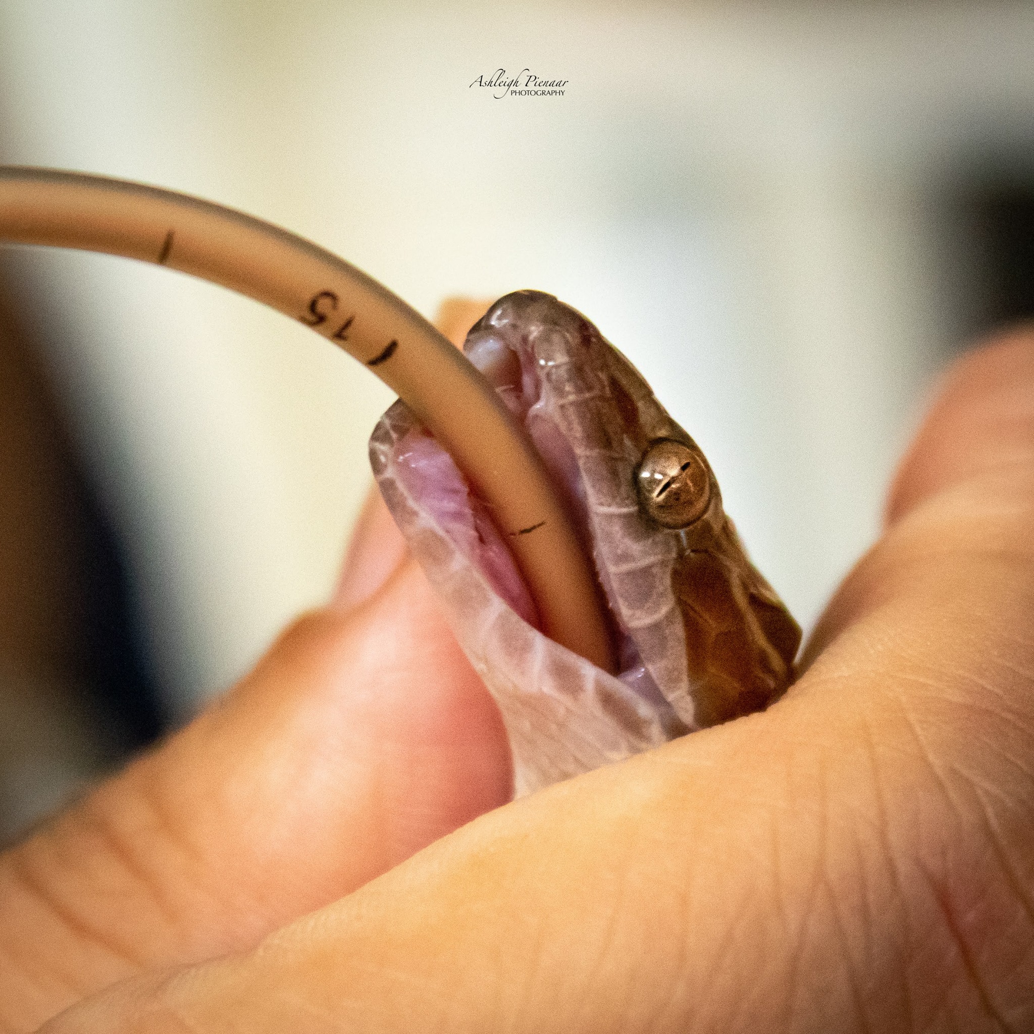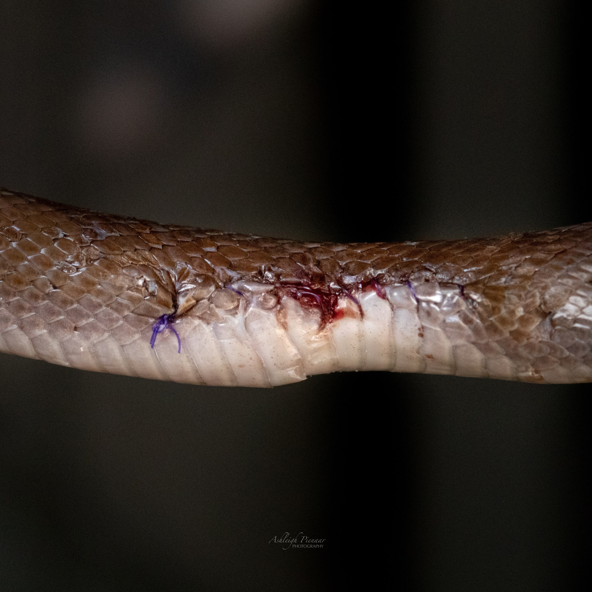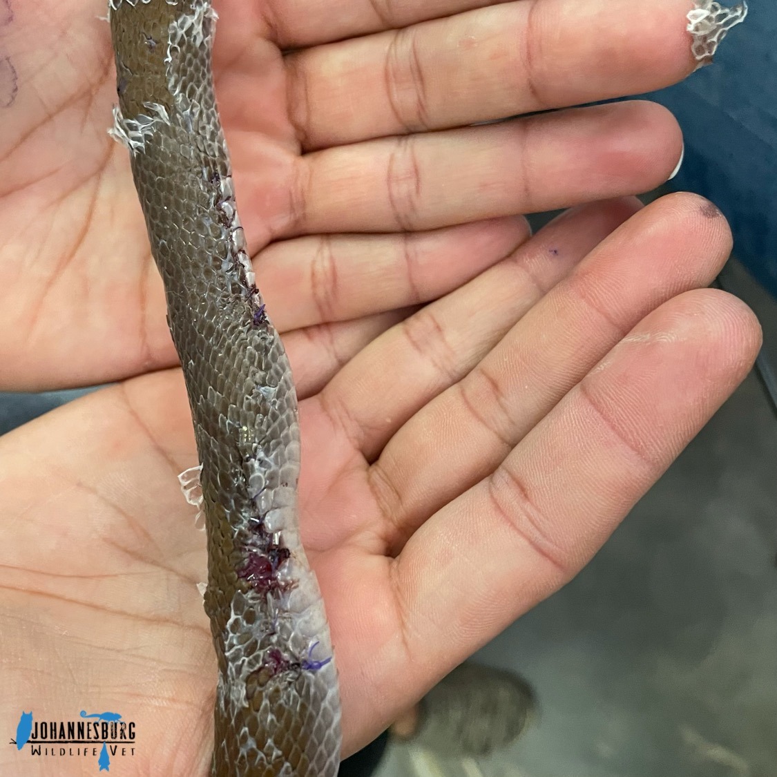“This Brown house snake (Boaedon capensis) was caught by a cat, and had with a few deep lacerations as a result – one of which exposed her stomach. The wounds were debrided (dead and infected tissue removed) under anaesthetic, with the two deepest wounds stitched closed. While receiving antibiotics and pain meds, she is also being tube fed every couple of days while we allow time for her wounds to heal. Once the wounds are fully healed, her stomach will be able to expand without risking her stitches tearing.