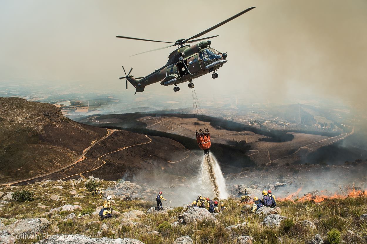A SANDF Oryx helicopter assists e NCC Hotshot & Working on fire ground crews by water bombing a flank 1200m above sea level on the Du Toits Kloof moutain pass, South Africa. (10/01/17)