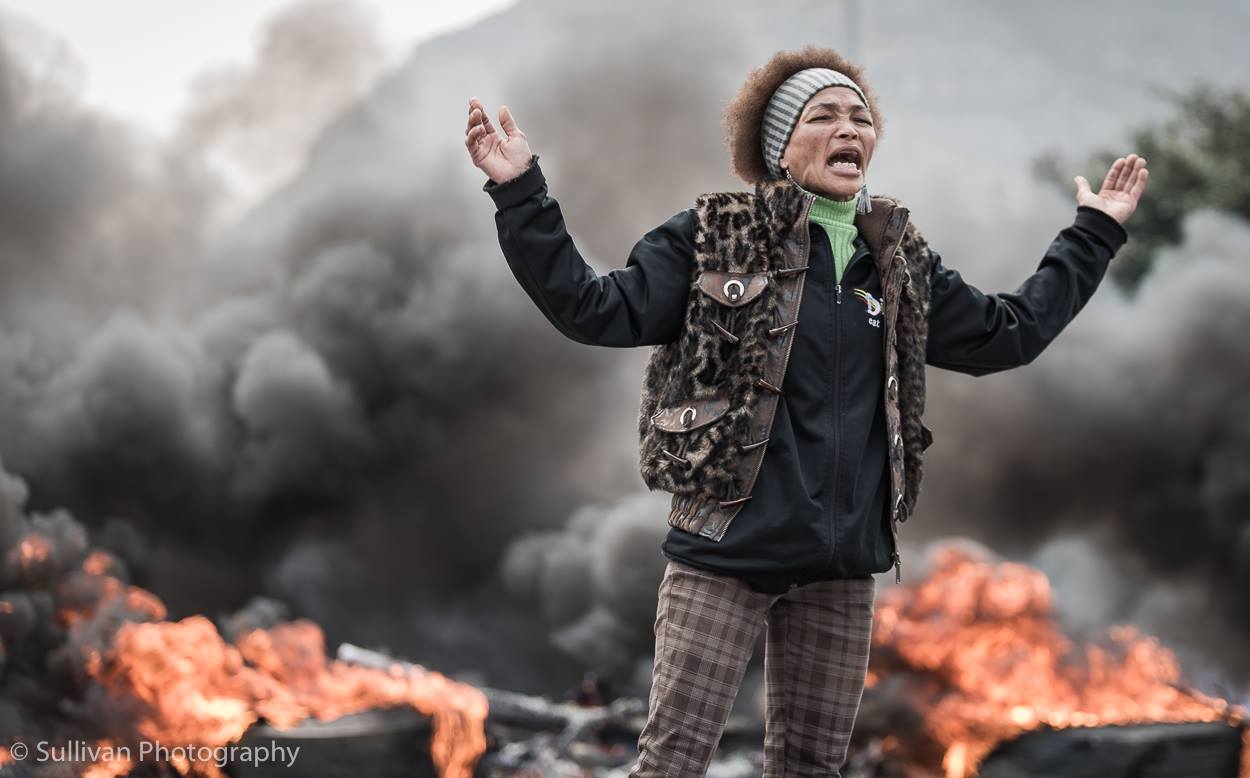 A woman cries out during protests that erupted in Hangberg, Hout Bay – South Africa. Fishermen said they were angry about a reduction in the rock lobster quota by 60kgs from 110kg to 50kg for the six-month fishing season. Protesters initially took to the streets peacefully, later being armed with petrol bombs, flares and rocks. A 3-day battle with riot police ensued with a truce finally being brokered in order to allow for peace talks. (12/09/17)