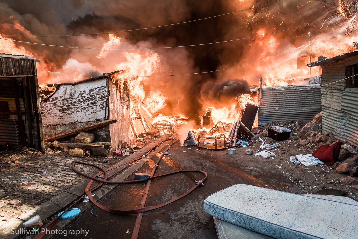 A narrow corridor burns during a Fire in Imizamo Yethu Informal Settlement in which the City of Cape Town describes as one of the worst informal settlement fires experienced to date: 4 500 structures were razed and approximately 15 000 residents affected. (11/03/17)