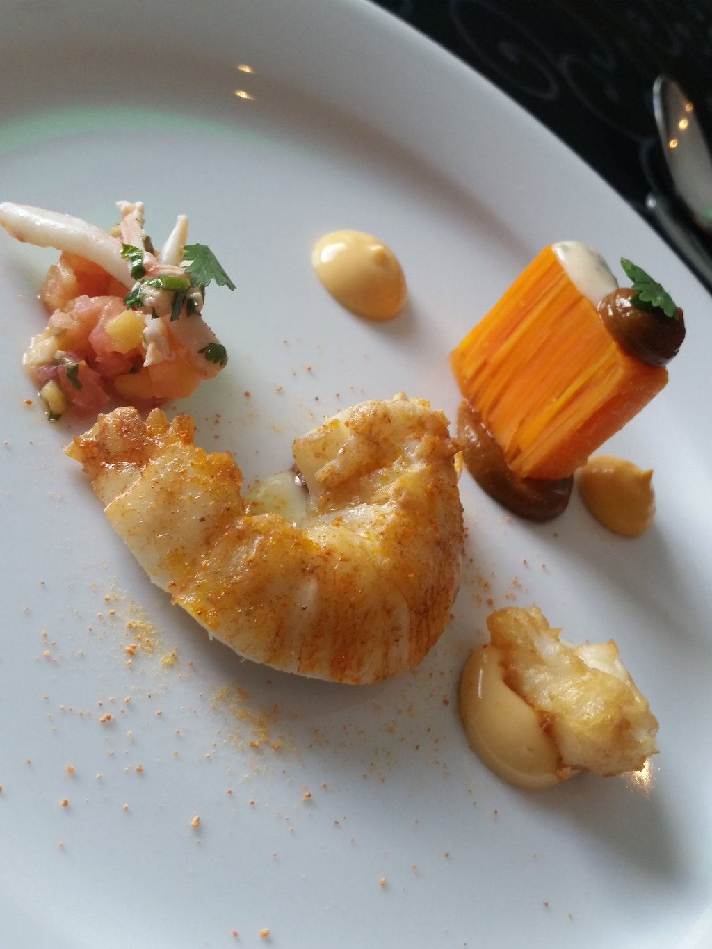 • Starter: Cape Crayfish ‘Malay’ – poached crayfish, pressed carrot terrine, carrot mayonnaise and Malay curry sauce.