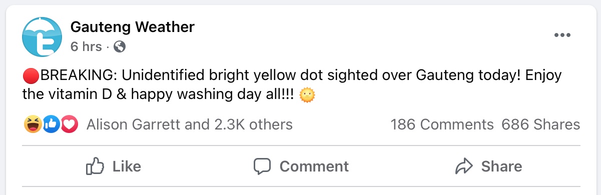 There have been several jokes floating around the internet of late, including one that goes along the lines of “if Joburgers don’t see the sun soon, they will be speaking British”. That one gave us a good chuckle. We found the meme that has been shared, take a look below.