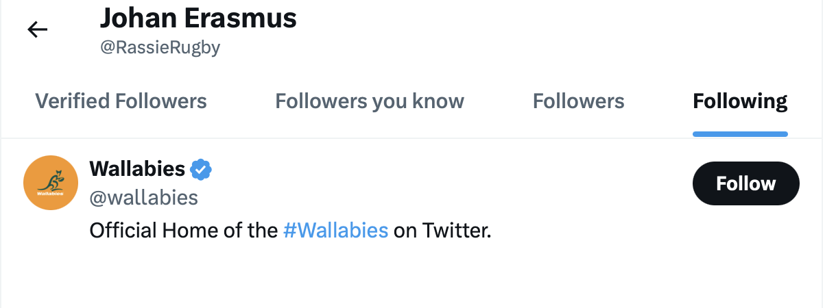 While most coaches are glued to game footage and team sheets, Rassie is making his first move where few expect it, on X. His latest move? Quietly following just one account. And that is the official page of the Australian national rugby team, ahead of the Springboks’ upcoming Test on 16 August at the iconic Ellis Park and 23 August at Cape Town Stadium. No captions, no explanation, just one follow at a time.