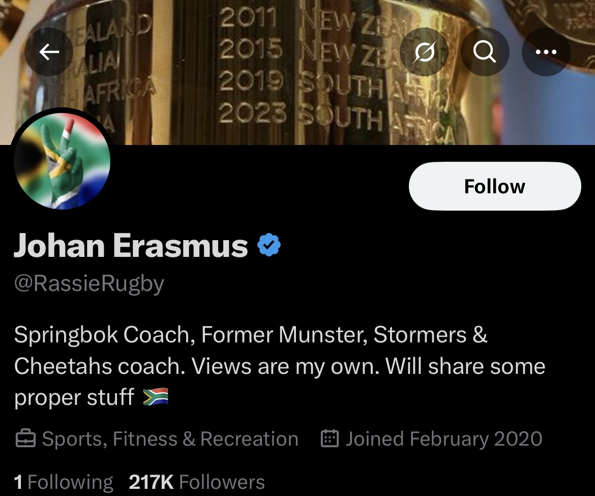 With over 200,000 followers on X, Rassie’s account has become a place of both rugby insight and entertainment. And just to add a bit of spice, his cover photo features the Webb Ellis Cup, a not-so-subtle reminder that South Africa currently holds rugby’s most desired prize.