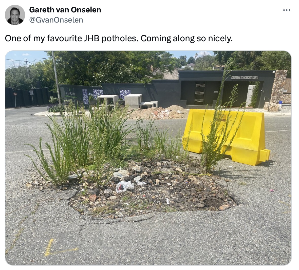 The latest viral pothole posted by Gareth van Onselen appears to be slowly transitioning from the Department of Public Works and Infrastructure’s problem to that of the Department of Agriculture, Forestry and Fisheries. We’re also not sure if a small family of critters has taken up residence here, but we wouldn’t be surprised.