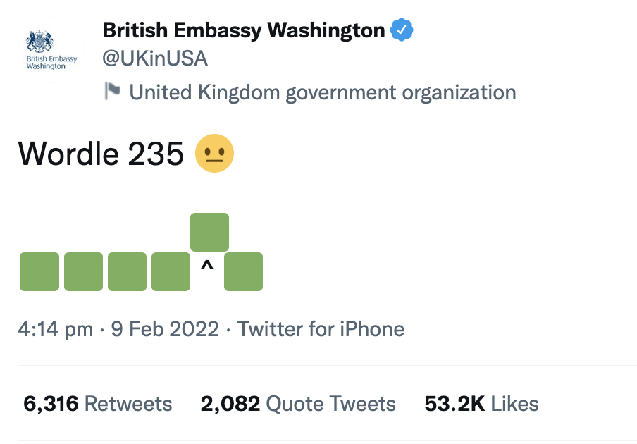 Whether you like Wordle or hate it… the British Embassy in Washington won the word of the day yesterday with a tweet, and it will make you giggle.