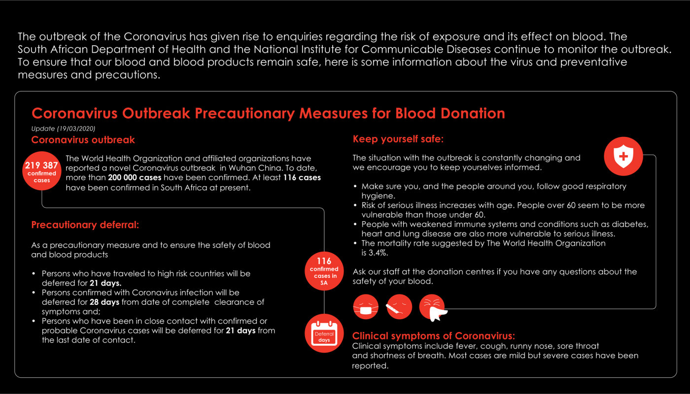 South Africa (19 March 2020) – During February, the South African National Blood Service (SANBS) outlined their precautionary measures leading up to a Covid-19 outbreak in South Africa. Now that there has been an outbreak, they want to reassure the public that they are still accepting blood and platelet donations.