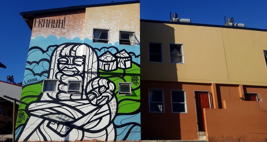 Colourful signage including a detailed rendition of Table Mountain, brightens a wall in the N2 Gateway Housing project in Langa. The work is unsigned and the artist unknown.