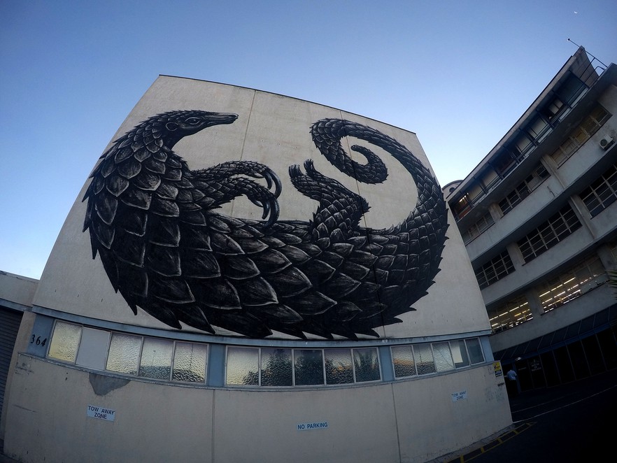 A giant pangolin painted by Belgian artist Rua lies on its back at a textile factory in Salt River. The pangolin is one of the most illegally traded species on the planet. Rua painted it during the annual International Public Art Festival last year in order to highlight the threat to this species. Rua’s animals can be found on walls in cities around the world, bringing attention to the disappearance of natural habitats.