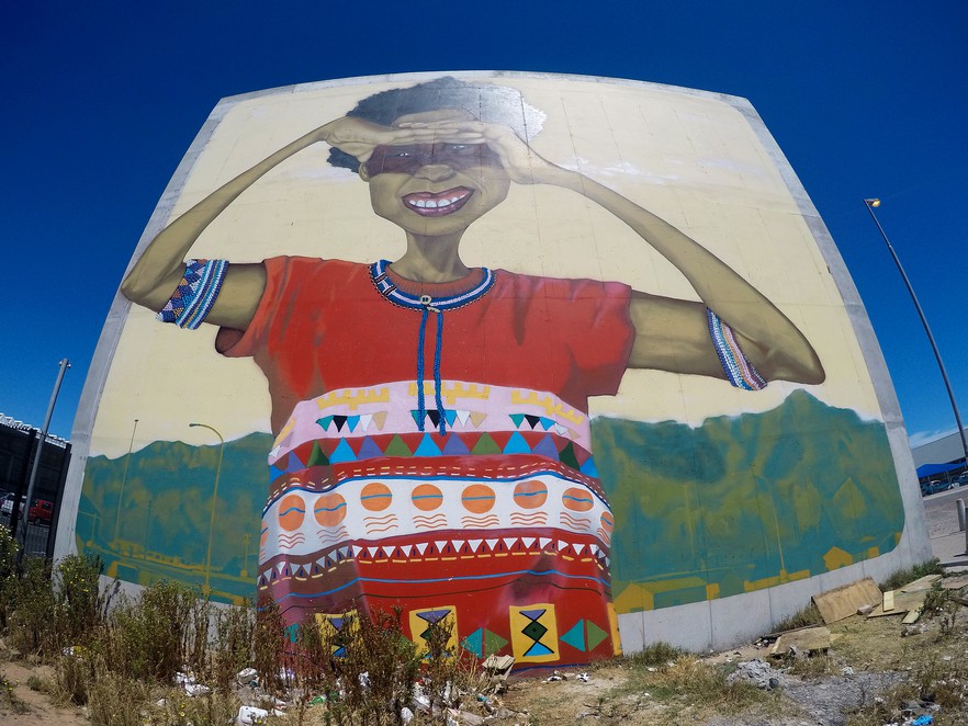One of Cape Town’s most photographed murals shows “Boniswa” shading her eyes from the sun as she looks across from the Isivivana Centre in Khayelitsha toward Table Mountain in the distance. Artist Breeze Yoko, who painted it in 2016, stated on his Instagram account that very few children living in Khayelitsha ever get to walk on the mountain. The work is dedicated to “the black girl child who holds the key and is gifted with the vision of the future”.