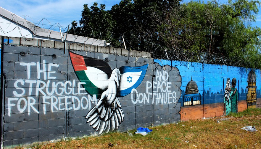 This mural, by SergeOne, in support of freedom and peace in Israel and Palestine overlooks an open field next to a bridge near Red Cross Hospital in Rondebosch.