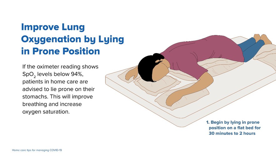 Patients on oxygen will be encouraged to lie on their tummy (in a prone position), as shown below. Amazingly this simple intervention can make a big difference as this study found.