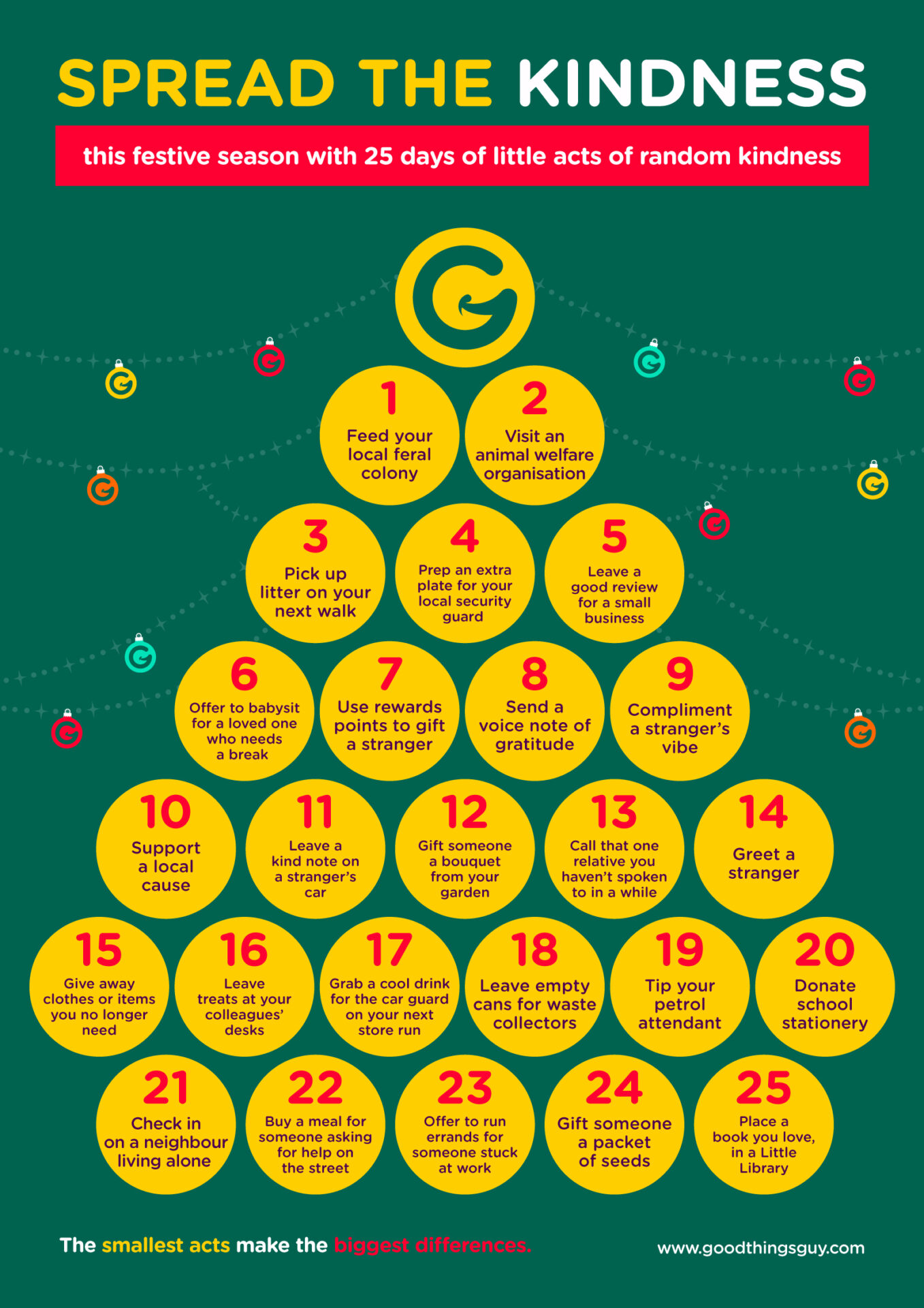 It’s the most wonderful time of the year, when people feel generous, and kindness is plentiful. We have 25 acts of kindness you can do each day as we celebrate the festive season.