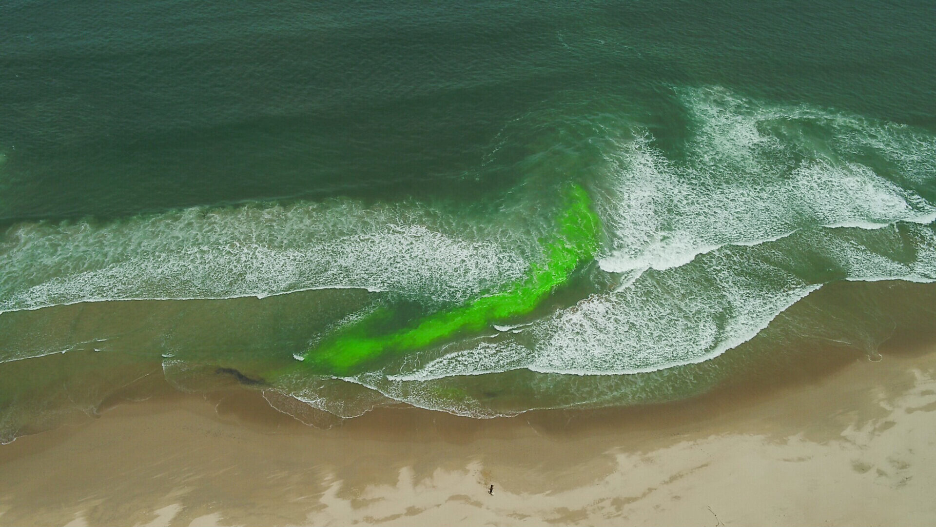 The NSRI shares tips on spotting rip currents (using bright green fluorescent dye to show examples) and advises you to only swim at lifeguarded beaches.
