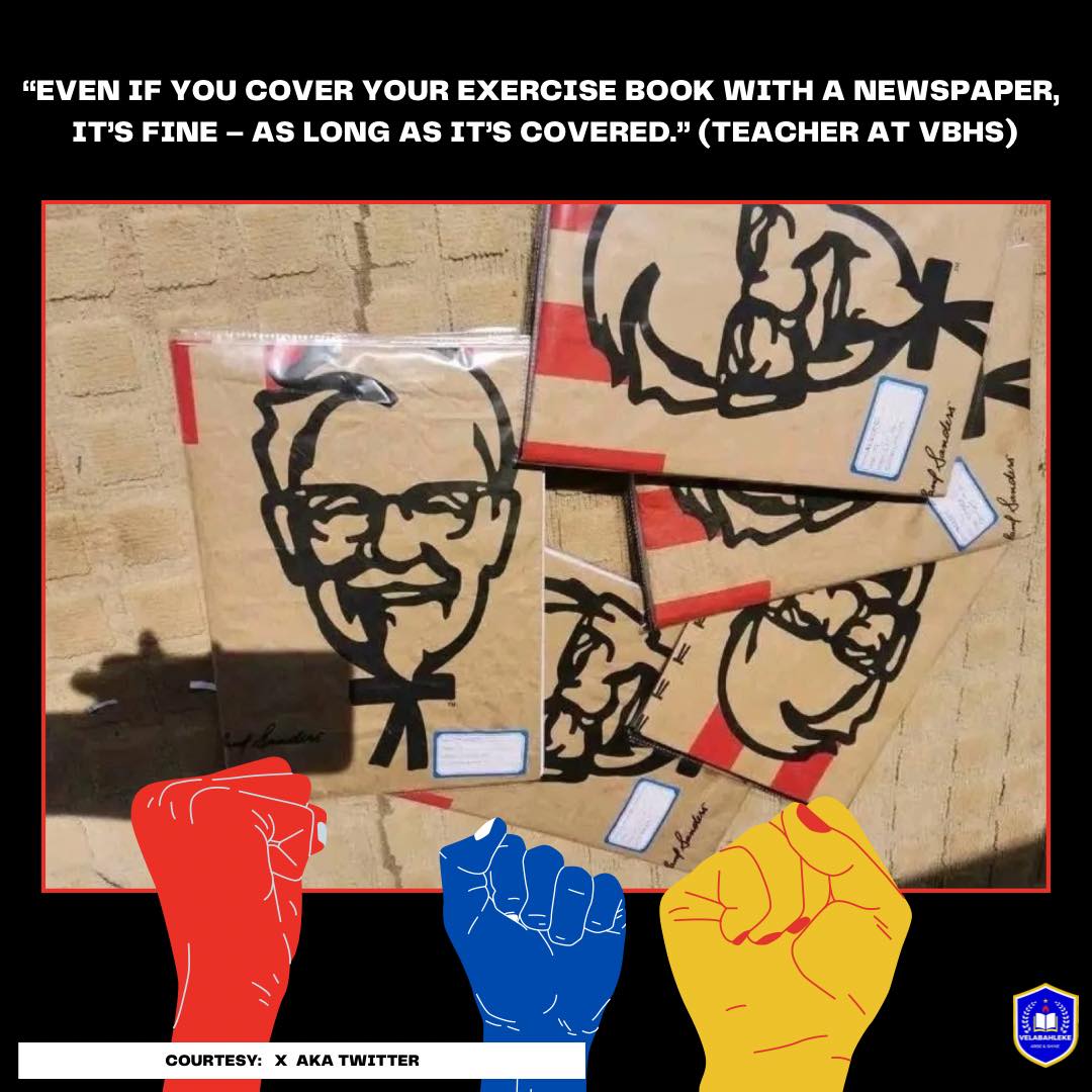Umlazi, South Africa (14 January 2025) – A humorous photo circulating the internet of school exercise books covered using KFC bags poked fun at the “Januworry” woes as parents prepare their kids for back to school. While the image easily sparked some laughter among some netizens, it inspired a powerful message on humility from Velabahleke High School in Umlazi, KwaZulu-Natal.