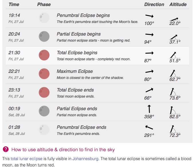 Did you know that a total eclipse never happens alone? A few weeks before and after, there is also a partial eclipse. This one’s companion eclipse will take place on the 13th of July 2018. Sadly, that won’t be visible in South Africa. You will also be able to see Mars and the Milky Way which will be to the left of the moon. With the light of the moon blocked by earth’s shadow, stars not often visible to the naked eye will be visible as well.