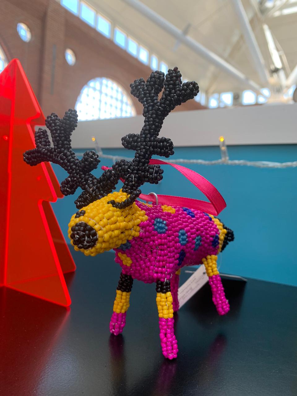 • A beaded reindeer dancing alongside old repurposed Christmas trees skinned with papier-mâché and felt