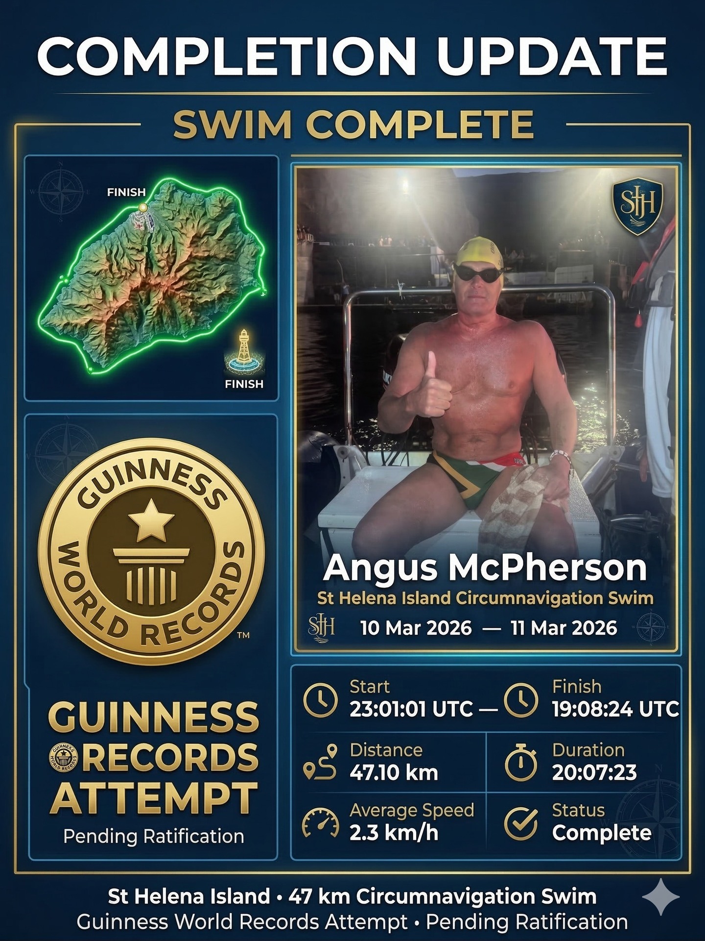 By the time he touched land, the tracker showed an extraordinary set of numbers: 47.10 kilometres completed in just over 20 hours. The swim is now being submitted as a Guinness World Records attempt and is believed to represent the first male completion of the St Helena Island circumnavigation swim, pending official ratification.