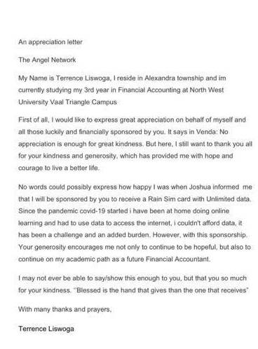 Terrence Liswoga was a recipient of data and he was able to catch up on all the work he missed out on. He was so grateful, he wrote a letter to the donors that helped him, thanking them for believing in his education.