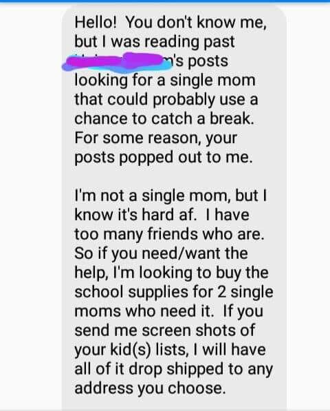 In the spirit of paying it forward, one woman decided to search out two single moms and offer to pay for their kid’s school supplies. She had gathered a list of single moms through Facebook mom groups and wanted to lighten their load a little.