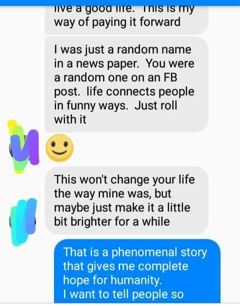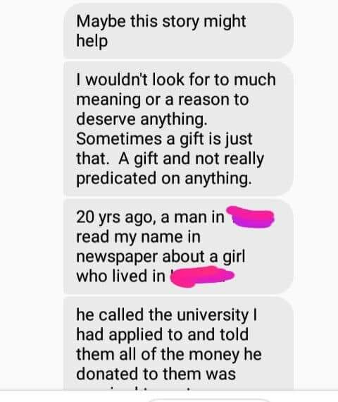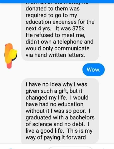 The man, which was all she knew about him, had paid for her to attend college for four full years. Meaning she was able to graduate debt free. She graduated with a bachelors degree in Science and it set her on a path that changed her life. She had grown up very poor and would probably never have completed college without this anonymous man’s help.
