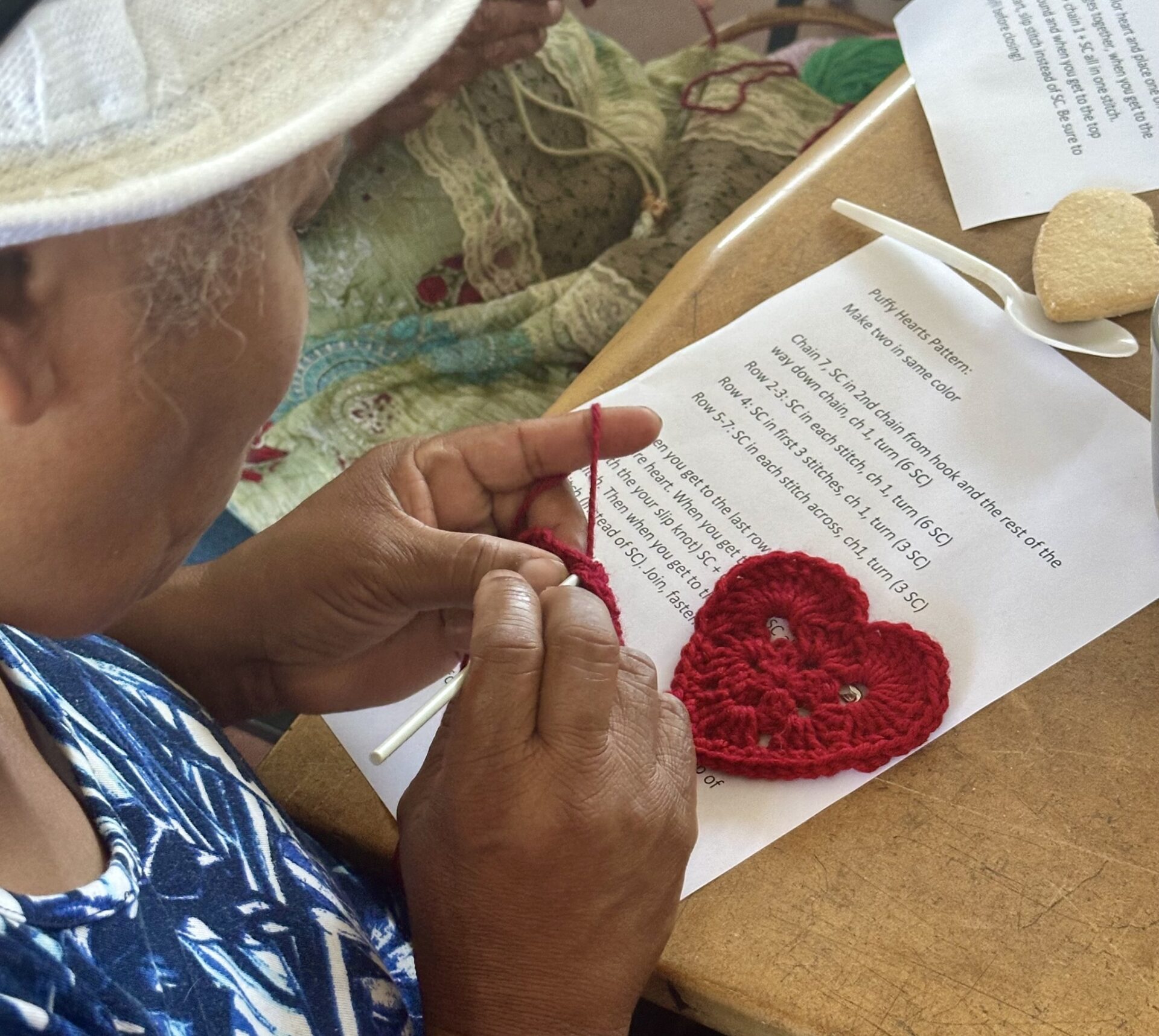 Armed with crochet hooks, the gogos took a crack at making puffy red hearts in anticipation of Valentine’s Day.