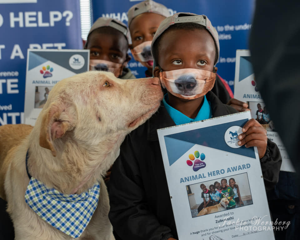 The Magnificent 5 then went over to Pick n Pay where they were given a backpack filled with clothing, a water bottle, a soccer ball, colouring kits and books, modelling clay, and sweets and snacks. The community donated dog food to AWS and the boys were given hero awards too!