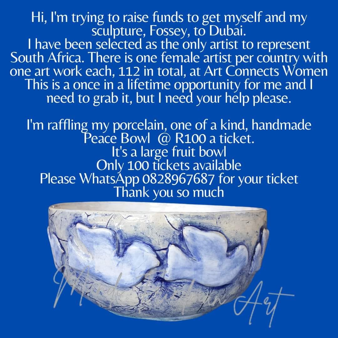 To fund her trip, she set up a raffle for a beautiful ‘Peace Bowl’ of her creation and it has been a great success! The event takes place in the first week of March 2024 and she is taking her sculpture called “Fossey”.