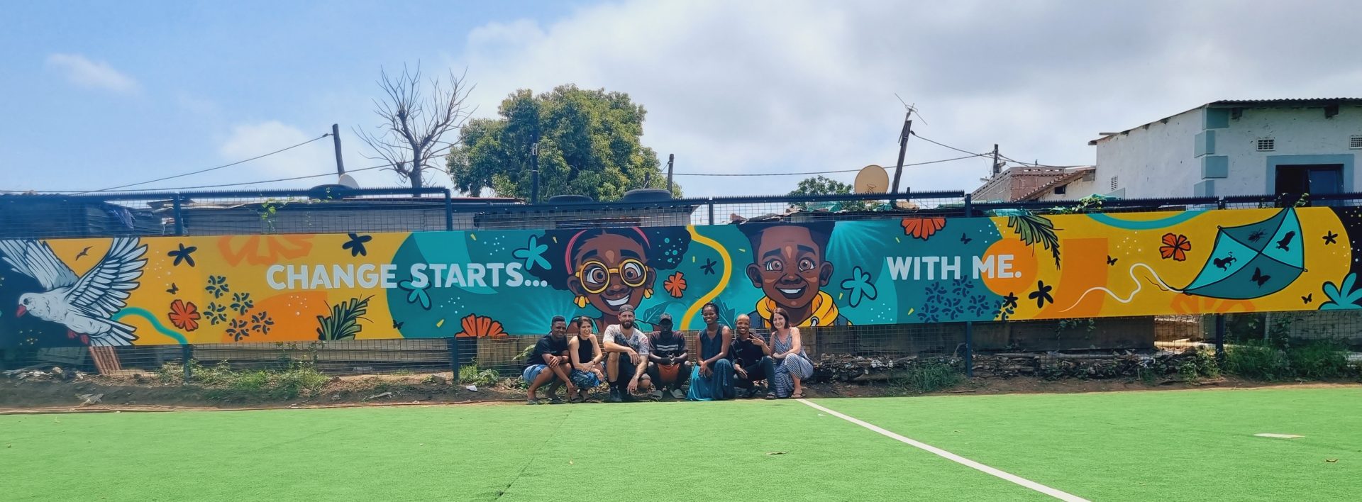 The artwork shares the positive message “Change starts with me” with the children and community of the Bhambayi community. Symbols and images were used that speak to perspective, courage, transformation, hard work, beauty and peace. This area suffers from terrible infrastructure, excessive levels of unemployment, particularly among young adults, and shocking levels of substance abuse, child rape, GBV and crime.