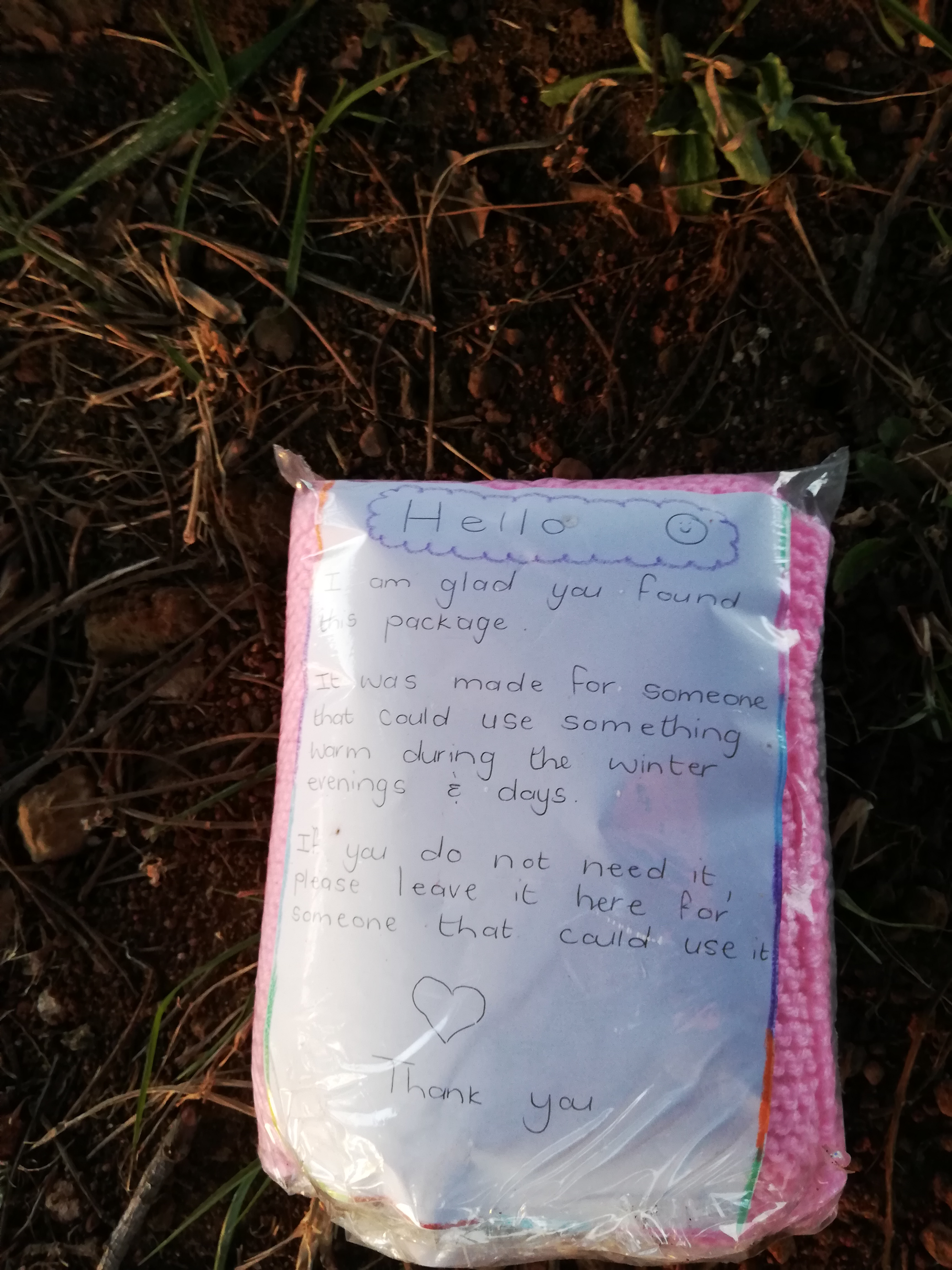 Jade du Toit was at the Waterfall Clinic when something caught her eye. She walked over and found a little package with a knitted blanket and a letter to the person who would possibly find the package. She knew this was meant for someone in need so she snapped a picture to send to us and placed the packages back where she found it.