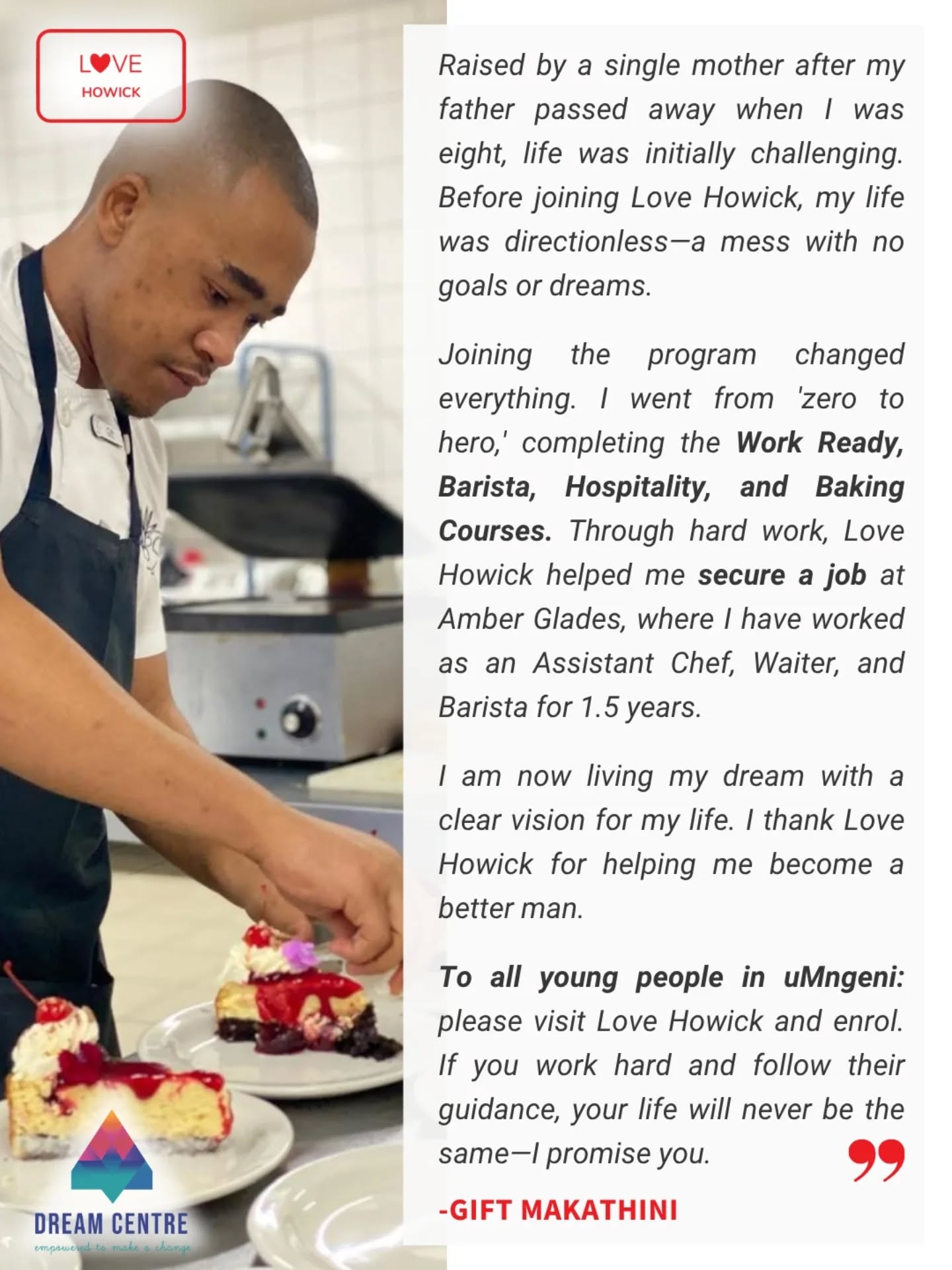 Gift Makathini described his youth as a “mess with no goals or dreams” until he took a crucial step and joined Love Howick’s Dream Centre programme.