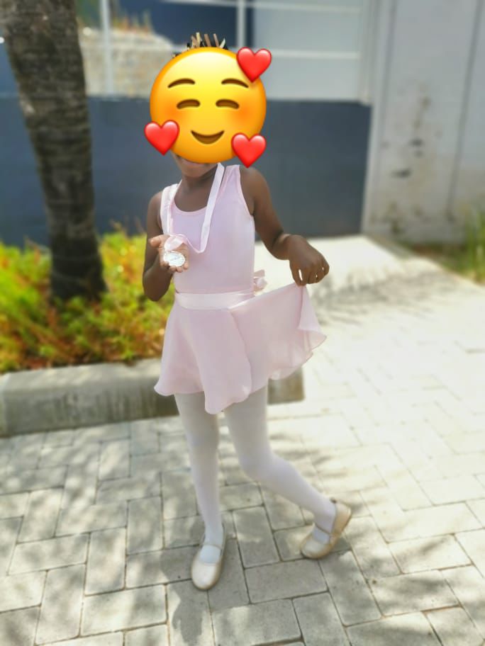 One of the requirements for the upcoming showcase is to have navy blue ballet clothing. Now the little ballerina has both pink and blue in her collection, thanks to the generous donations sent to Play It Forward Jozi. She has brand-new leather ballet shows, a navy blue leotard and tutu and two pairs of pink ballet tights.