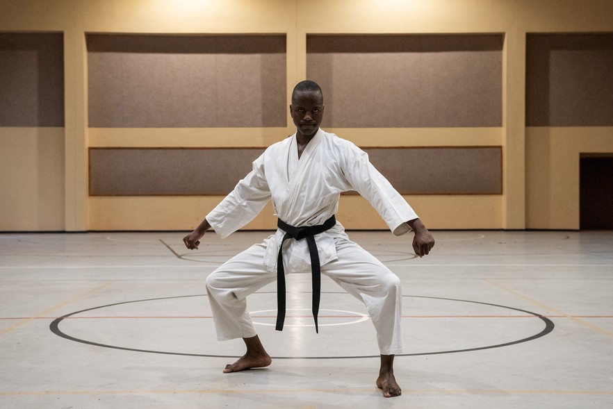 Khazimla Malusi, 19, began karate in 2017 with Mpothulo. He trains every day at the Langa Centre after he finishes school in Athlone. He was recently awarded his black belt Shodan in November. The disciplined martial arts training helps him cope under pressure.
