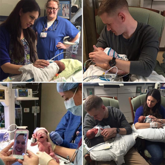 Tony Burch, a 30-year-old Army captain deployed in South Korea, used FaceTime to watch his wife give birth to quadruplets at the AMITA Health Adventist Medical Center in Hinsdale, Illinois.